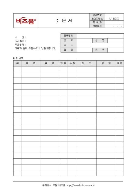 회사에서 제품 및 원자재를 주문할때 사용하는 서식이다. 구성요소는 제품명, 납품기한, 납품장소등으로 구성되어 있으며 주문서 작성시 해당 부서장에게 결재를 받아야 한다.