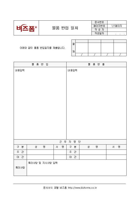물품 반입일지입니다. 물품반입, 물품반출, 근무자명단 등의 항목으로 구성되어 있습니다.