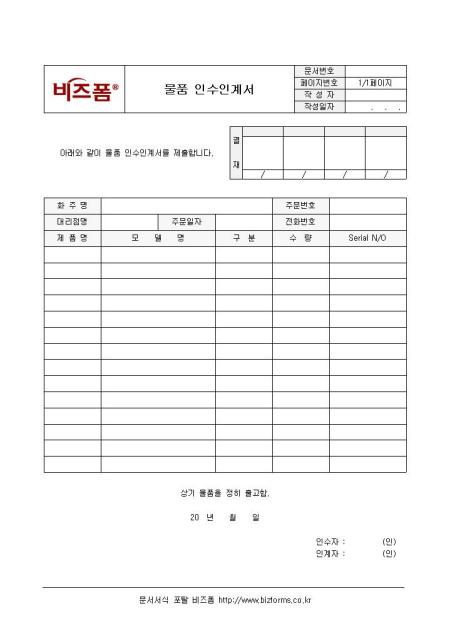 물품 인수인계서입니다. 인수인게 제품명, 모델명, 구분, 수량, 시리얼 넘버 등의 항목으로 구성되어 있습니다.
