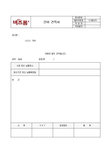 간이견적서(기본양식)입니다. 공사명, 견적금액, 시공 및 납품장소, 공시기간 또는 납품예정일 등의 항목으로 구성되어 있습니다.