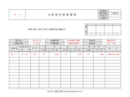 고정자산의 총괄 관리를 위한 고정자산 총괄대장입니다. 관리기간, 시설명, 자산단위, 관련대장번호 등의 항목으로 구성되어있으며 고정자산의 총괄적인 내용을 작성합니다.