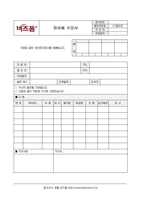 원자재주문서입니다. 의뢰처, 참조인, 모델명, 발주량 등의 항목으로 구성되어 있습니다.