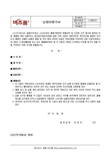 납품 이행각서입니다. 이행사항에 대한 내용과 제재사유, 수요처, 계약명, 배정금액, 납품기한 등의 항목으로 구성되어 있습니다.