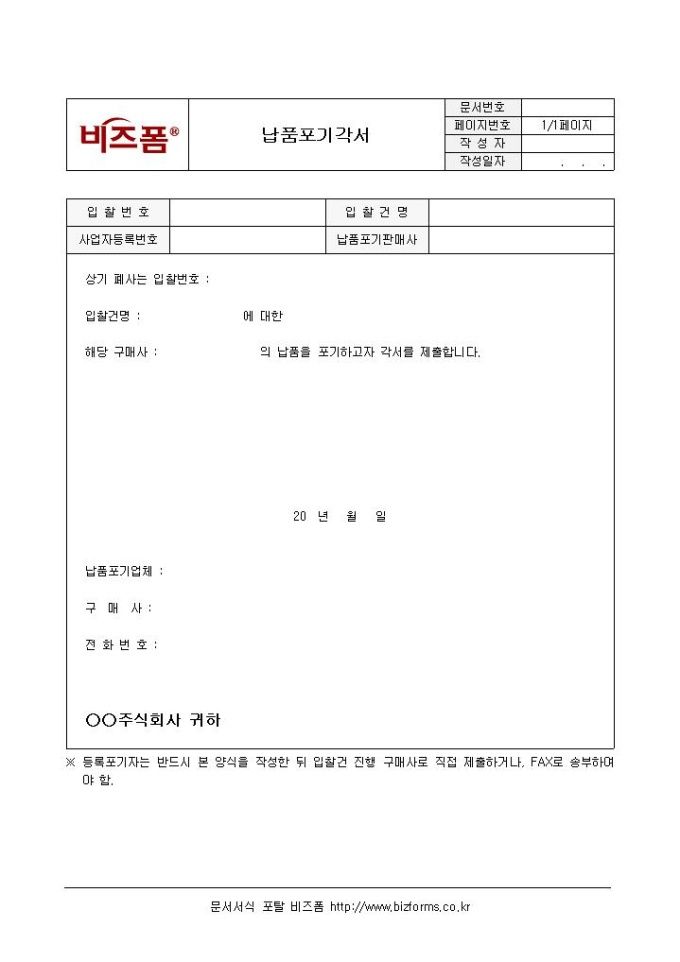 9,000원/월납품 포기각서입니다. 입찰번호, 입찰건명, 사업자등록번호, 납품포기판매사 등의 항목으로 구성되어 있습니다.