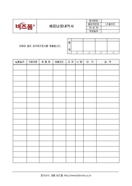 납품 내역서입니다. 납품일자, 거래처명, 제품명, 제품코드, 규격, 수량, 단가, 금액 등의 항목으로 구성되어 있습니다.