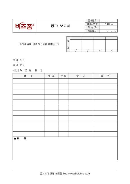 입고보고서입니다. 주문서, 송품장, 수입일자, 품명, 적요, 수량, 단가, 금액 등의 항목으로 구성되어 있습니다.