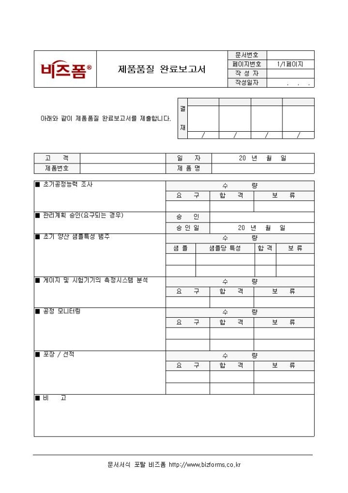 9,000원/월제품품질 완료보고서입니다. 초기공정능력 조사, 관리계획 승인, 초기 양산 샘플특성 범주, 게이지 및 시험기기의 측정시스템 분석, 공정 모니터링, 포장/선적, 비고 등의 항목으로 구성되어 있습니다.