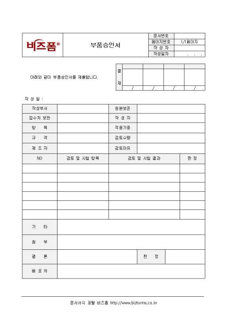 부품 승인서 입니다. 작성부서, 원존보존, 접수처 보관, 작성자, 항목, 적용기종, 규격, 검토수량, 제조자, 검토이유, 검토 및 시험 항목, 검토및 시험 결과, 판정 등의 항목으로 구성되어 있습니다.