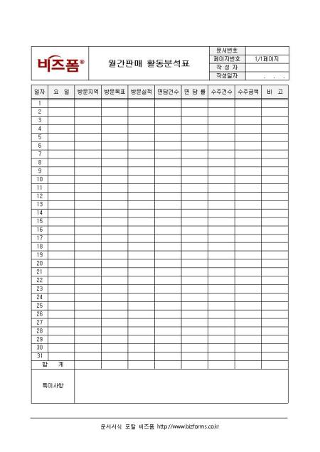 월간판매 활동분석표입니다. 일자, 요일, 방문지역, 방문목표, 방문실적, 면담건수, 면담률 등으로 구성되어있습니다.