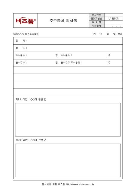 주주총회에서 발생된 내용을 기록할때 사용하는 서식으로 구성요소는 일시, 장소 주식총수등으로 구성되어 있으며 총회의 의사에는 주주총회의사록 작성하여야 하며, 경과요령과 그 결과를 기재하고 의장과 출석한 이사가 기명날인 하여 본점에 비치하고 그 사본을 지점에 비치한다.