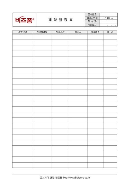계약일정표입니다. 계약건명, 계약체결일, 계약기간, 상대자, 계약품목 등으로 구성되어 있습니다.