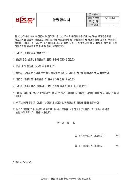 합병합의서입니다. 합병을 하기위한 기본조건을 명시하였습니다.