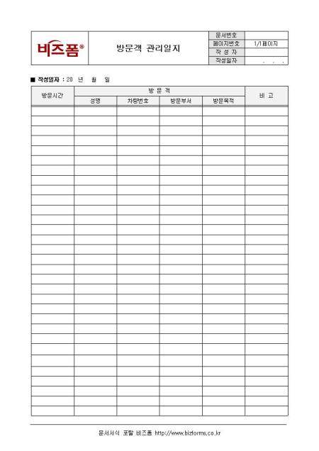 방문객 관리일지입니다. 방문시간, 차량번호, 방문부서, 목적등으로 구성되어 있습니다.