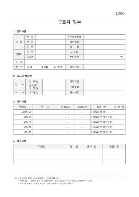 표준서식 ver 2.0은 대한민국 문서·서식 대표브랜드 비즈폼이 100여건의 중소기업 실무서식을 연구·분석하여 제작한 실무에 가장 적합한 표준 서식입니다. 샘플내용, 표준규정, 작성방법 등 문서 하나에 모든 내용이 포함되어 문서작성부터 행정처리까지 가능합니다. * 표준 근로자 명부(인사규정, 작성방법 포함)는 , 근로계약과 관련된 중요한 문서 중 하나로 변경사항 발생 시 지체없이 정정하여야 하며, 회사의 규모와 성격에 맞게 내용과 항목을 수정하여 활용하실 수 있습니다. * 세부 항목 : 인적사항, 입사/퇴사사항, 학력사항, 자격사항, 어학능력, 경력사항, 가족관계 등