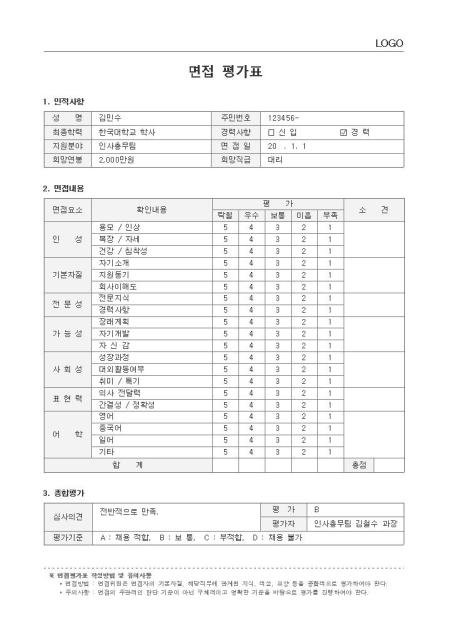 표준서식 ver 2.0은 대한민국 문서·서식 대표브랜드 비즈폼이 100여건의 중소기업 실무서식을 연구·분석하여 제작한 실무에 가장 적합한 표준 서식입니다. 샘플내용, 표준규정, 작성방법 등 문서 하나에 모든 내용이 포함되어 문서작성부터 행정처리까지 가능합니다. * 표준 면접평가표(인사규정, 작성방법 포함)는 면접자의 기본자질, 해당직무에 관계된 역량을 종합적으로 평가하는 서식으로, 회사의 규모와 성격에 맞게 내용과 항목을 수정하여 활용하실 수 있습니다. * 세부 항목 : 인적사항, 면접내용, 종합평가 등