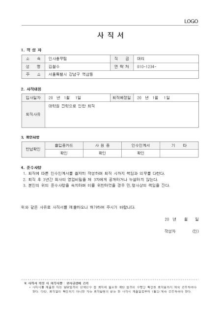 표준서식 ver 2.0은 대한민국 문서·서식 대표브랜드 비즈폼이 100여건의 중소기업 실무서식을 연구·분석하여 제작한 실무에 가장 적합한 표준 서식입니다. 샘플내용, 표준규정, 작성방법 등 문서 하나에 모든 내용이 포함되어 문서작성부터 행정처리까지 가능합니다. * 표준 사직서(인사규정, 작성방법 포함)는 퇴직사유 퇴직예정일 등을 기재하고 퇴사 시 비품반납 및 확인사항을 체크하고 준수사항에 따른 서약 등의 내용이 포함되어 있으며, 회사의 규모와 성격에 맞게 내용과 항목을 수정하여 활용하실 수 있습니다. * 세부 항목 : 작성자, 사직내용, 확인사항, 준수사항 등