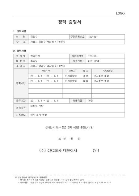 표준서식 ver 2.0은 대한민국 문서·서식 대표브랜드 비즈폼이 100여건의 중소기업 실무서식을 연구·분석하여 제작한 실무에 가장 적합한 표준 서식입니다. 샘플내용, 표준규정, 작성방법 등 문서 하나에 모든 내용이 포함되어 문서작성부터 행정처리까지 가능합니다. * 표준 경력증명서(인사규정, 작성방법 포함)는 퇴직이후 근로자가 요청 시 회사에서 근무한 경력사항을 확인해 주는 용도로 쓰이며, 회사의 규모와 성격에 맞게 내용과 항목을 수정하여 활용하실 수 있습니다. * 세부 항목 : 인적사항, 경력사항, 퇴직사유, 사용용도 등