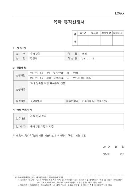 표준서식 ver 2.0은 대한민국 문서·서식 대표브랜드 비즈폼이 100여건의 중소기업 실무서식을 연구·분석하여 제작한 실무에 가장 적합한 표준 서식입니다. 샘플내용, 표준규정, 작성방법 등 문서 하나에 모든 내용이 포함되어 문서작성부터 행정처리까지 가능합니다. * 표준 육아휴직신청서(인사규정, 작성방법 포함)는 만6세 이하의 초등학교 취학 전 자녀가 있는 근로자의 경우 작성가능하며, 회사의 규모와 성격에 맞게 수정하여 활용하실 수 있습니다. * 세부 항목 : 신청인, 신청내용, 신청사유, 첨부서류, 비상연락망, 업무인수인계 등