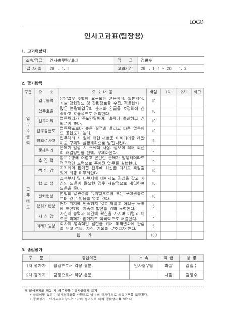 표준서식 ver 2.0은 대한민국 문서·서식 대표브랜드 비즈폼이 100여건의 중소기업 실무서식을 연구·분석하여 제작한 실무에 가장 적합한 표준 서식입니다. 샘플내용, 표준규정, 작성방법 등 문서 하나에 모든 내용이 포함되어 문서작성부터 행정처리까지 가능합니다. * 표준 인사고과표(팀장평가)(인사규정, 작성방법 포함)는 인사고과자에 대한 승진여부를 결정하는 중요한 문서로, 회사의 규모와 성격에 맞게 내용과 항목을 수정하여 활용하실 수 있습니다. * 세부 항목 : 고과대상자, 평가항목, 종합평가 등