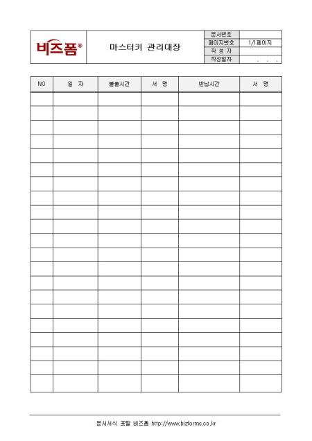 마스터키관리대장입니다. 일자, 불출시간, 서명, 반납시간등의 항목으로 구성되어있습니다.