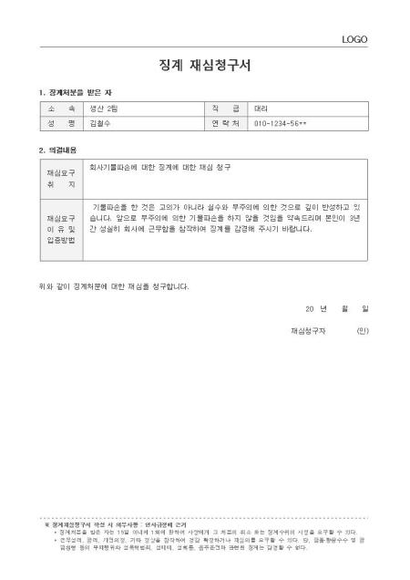 표준서식 ver 2.0은 대한민국 문서·서식 대표브랜드 비즈폼이 100여건의 중소기업 실무서식을 연구·분석하여 제작한 실무에 가장 적합한 표준 서식입니다. 샘플내용, 표준규정, 작성방법 등 문서 하나에 모든 내용이 포함되어 문서작성부터 행정처리까지 가능합니다. * 표준 징계재심청구서(인사규정, 작성방법 포함)는 징계대상자에 대해 징계사유 및 의견 등을 기재하여 징계 의결을 요구하는 문서로, 회사의 규모와 성격에 맞게 수정하여 활용하실 수 있습니다. * 세부 항목 : 징계대상자, 징계사유 등