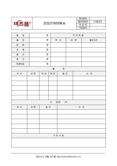 일일인원현황표입니다. 일일 인원 현황을 체크할 수 있습니다. 항목은 총원, 지각현황, 출장, 조퇴, 휴가, 기타사항 등의 항목으로 구성되어 있습니다.
