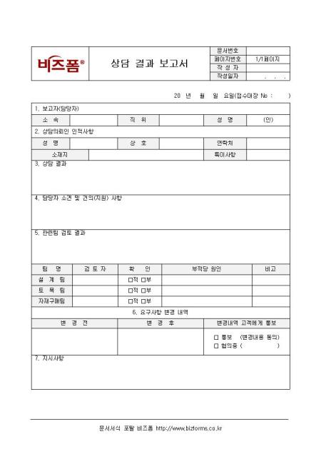 상담 결과 보고서입니다. 보고자, 상담의뢰인 인적사항, 상담결과, 담당자 소견 및 건의 사항, 관련팀 검토결과 등의 항목으로 구성되어 있습니다.