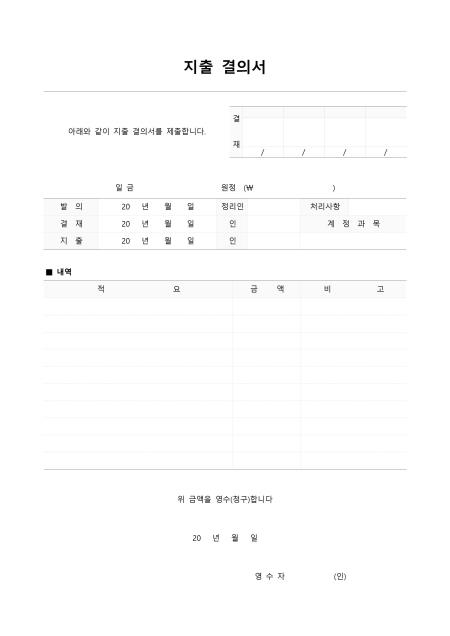 회사에서 필요한 물품을 구매할때 사용하는 서식이다. 구성요소는 발의, 결제, 지출, 적요등으로 구성되어 있으며 모든 지출결의서의 내용은 반드시 예산관리대장에 기재하여야 하며 결재자는 예산금액을 반드시 확인하여 결재하여야 한다
