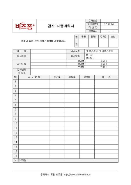 감사 시행계획서(일반양식)입니다. 경영부에서 많이 사용되고 있으며, 감사시행에 대한 계획서 입니다. 감사항목, 감사원, 감사대상, 목적 등으로 이루어져 있습니다.