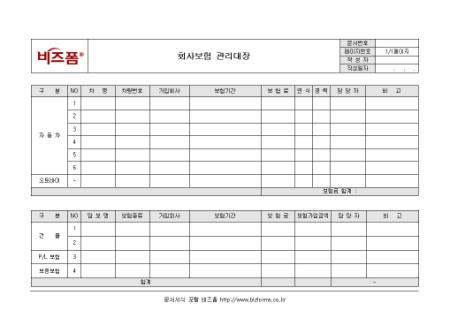 회사보험 관리대장 입니다. 회사보험과 관련하여 쓰이는 서식으로서 차량번호, 보험기간, 보험료, 가입회사 등으로 이루어져 있습니다.