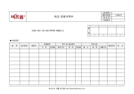 자금운용 기록부 입니다. 회사의 자금운용에 대한 기록부로서 경리부에서 많이 사용되며 예금액, 이자수입, 예금잔액 등으로 구성되어 있습니다.
