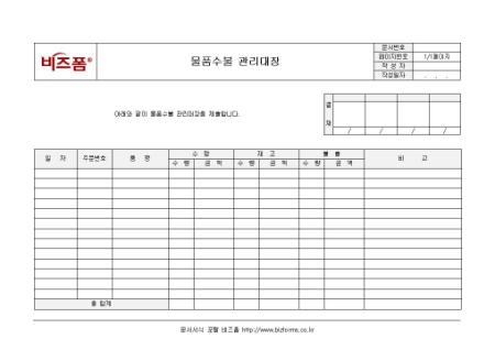 물품수불 관리대장입니다. 물품 수불 후 관리하는 서식으로 주문번호, 품명, 수량, 금액 등으로 이루어져 있습니다.