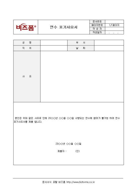 연수 포기사유서 입니다. 연수에 불참시 사용하는 서식으로 사유, 직위 등으로 이루어져 있습니다.