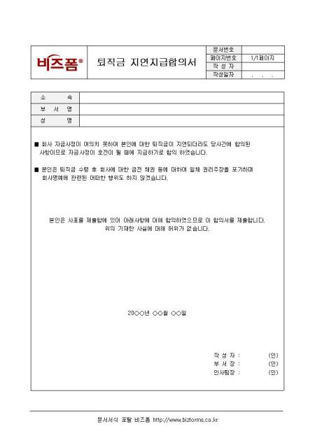퇴직금 지연지급합의서입니다. 퇴직금 지연에 대한 합의서로서 소속, 부서명, 지연사유 등으로 이루어져 있으며 경리부에서 사용되고 있습니다.