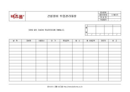 건설장비 투입관리대장입니다. 자재/생산부에서 사용되며 장비명, 사용대수, 투입금액 등으로 구성되어 있습니다.