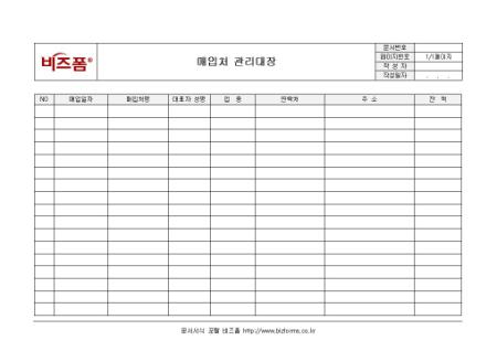 매입처 관리대장입니다. 경리부에서 사용하는 서식으로 매입처의 정보를 입력할 수 있으며 매입처명, 대표자 성명, 주소등으로 이루어져 있습니다.
