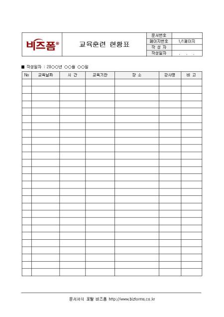 교육훈련 현황표입니다. 교육훈련에 관하여 작성하는 서식으로 교육기관, 교육날짜, 장소, 강사명 등으로 구성되어 있으며 총무부에서 사용되는 서식입니다.