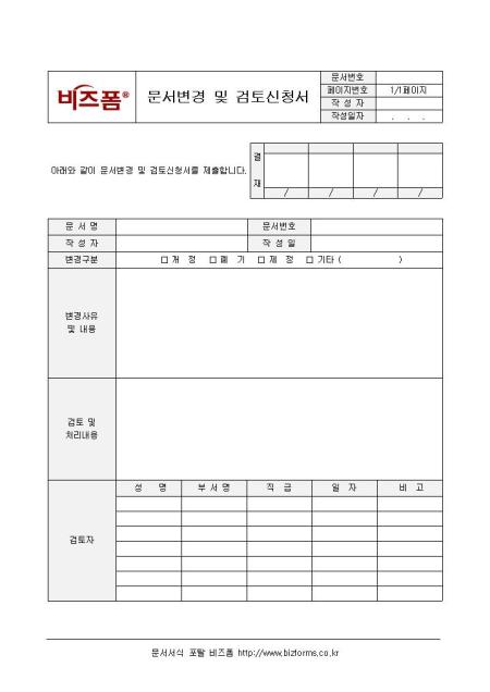 문서변경 및 검토신청서입니다. 문서를 변경하거나 검토신청시 필요한 서식으로 문서명, 문서번호, 변경사유 및 내용등으로 이루어져 있습니다.