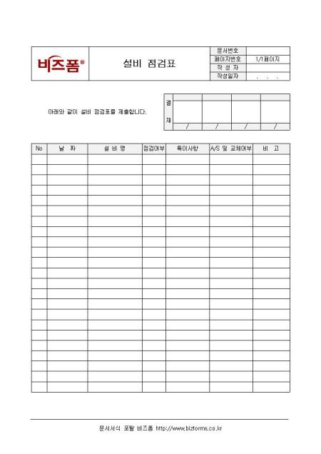설비점검표입니다. 설비점검 후 체크하는 서식으로 설비명, 점검여부, 특이사항등으로 이루어져 있으며 자재/생산부에서 많이 사용하는 서식입니다.