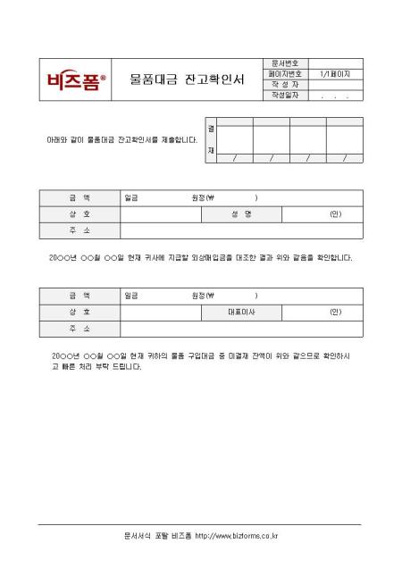 물품대금 잔고확인서입니다. 물품대금 잔고에 대해 알릴 때 사용하는 서식으로 경리부에서 많이 사용하는 서식입니다.