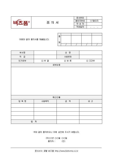 기안 품의서입니다. 지출 품의서에 대한 서식으로 세부내용, 예산산출, 사용목적 등으로 구성되어 있습니다.