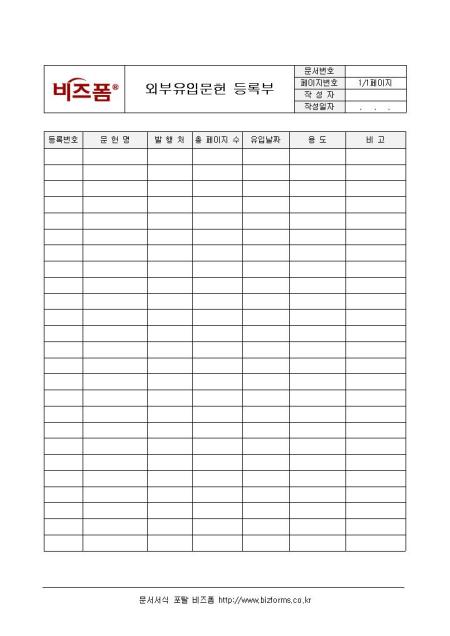 외부유입문헌 등록부입니다. 외부에서 유입된 문헌을 기록하는 등록부로 총무부에서 사용하는 서식입니다. 등록번호, 문헌명, 발행처, 유입날짜 등으로 구성되어 있습니다.