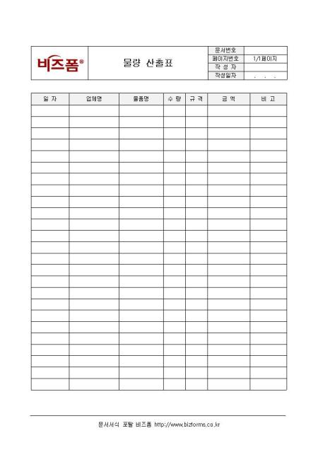 물량 산출표입니다. 물량 산출에 대한 내용을 작성하는 문서로 일자, 업체명, 물품명, 수량, 규격, 금액, 비고 등으로 구성되어 있습니다.