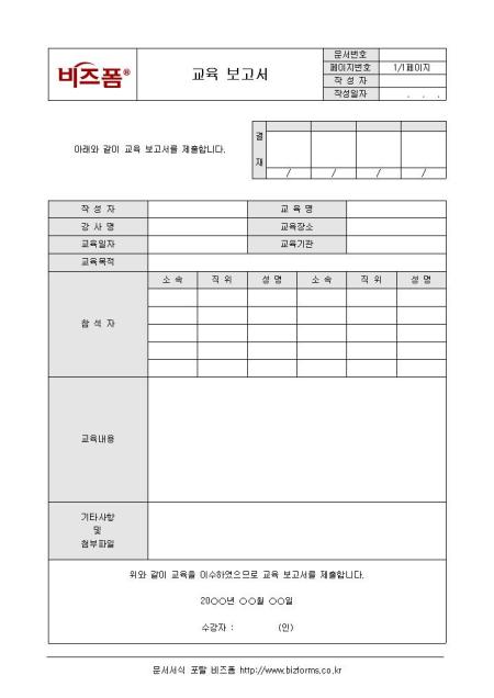 교육 보고서입니다. 교육 참석 후 교육에 대한 보고서로 작성자, 교육명, 교육장소, 교육일자, 교육목적, 참석자, 교육내용, 첨부파일 등으로 구성되어 있습니다.