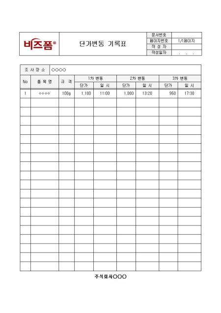 단가변동기록표(변동추이확인)입니다. 단가변동을 기록 및 확인(변동추이확인)을 위해 작성할 시 사용할 수 있으며 조사장소, 품목명, 규격, 단가, 일시 등의 항목으로 구성되어 있습니다.