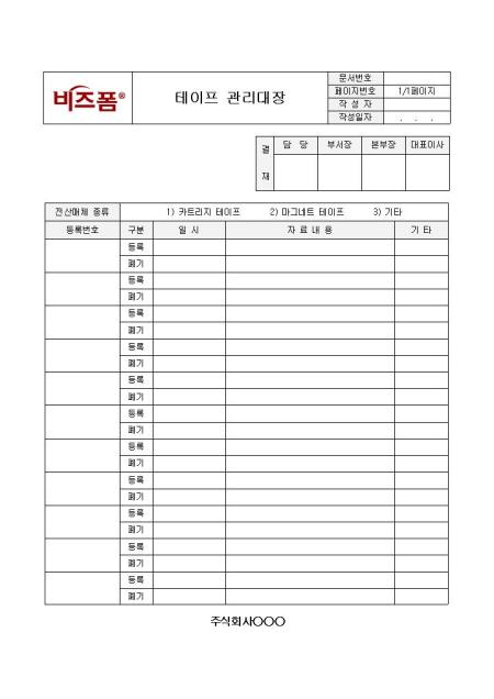 테이프 관리대장입니다. 전산 매체종류, 등록번호, 일시, 자료내용 등의 항목으로 구성되어 있습니다. 테이프를 정리 및 보관이 용이하도록 관리하기 위해 사용할 수 있습니다.