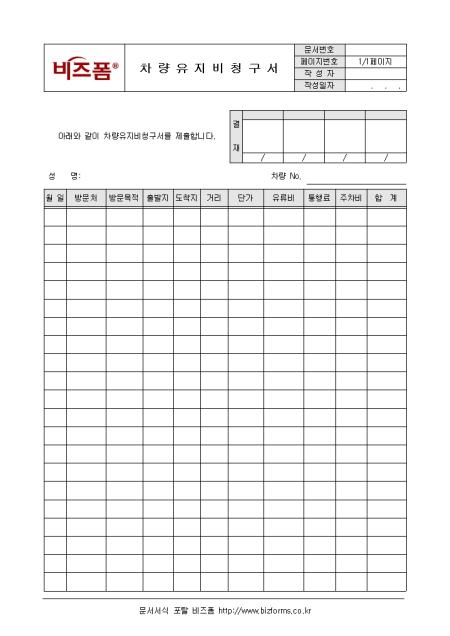 차량의 유지비를 신청할 때 사용하는 서식이다.구성요소는 방문처, 방문목적, 출발지, 도착지등으로 구성되어 있으며 차량유지비를 지원받고자 하는 임직원은 주관 부서에 차량유지비청구서를 신청하고 주관부서는 사장의 결재를 득한 후 시행한다.