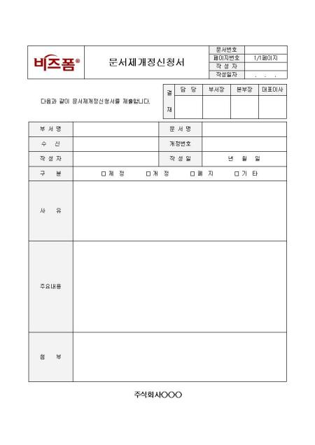 문서제개신청서입니다. 문서명, 작성자, 개정번호, 사유, 주요내용 등의 항목으로 구성되어 있습니다. 문서의 제정 및 개정 신청을 위해 사용할 수 있습니다.