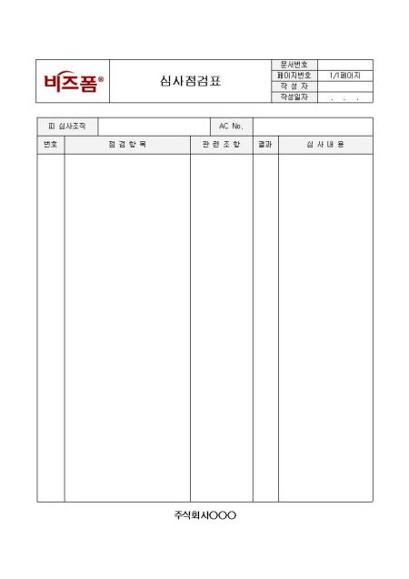 심사점검표입니다. 피 심사조직, 점검항목, 관련조항, 결과, 심사내용 등의 항목으로 구성되어 있습니다. 심사 내용을 점검할 시 사용할 수 있습니다.