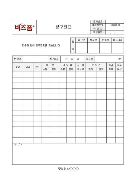 청구전표(간단양식)입니다. 품명, 규격, 단위, 예산 등의 항목으로 구성되어 있습니다. 청구전표를 작성할 시 사용할 수 있습니다.